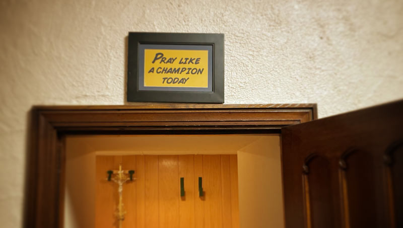 The sign is a play off the famous one in the stairwell between the locker room and the field at Notre Dame University. (That one says, “Play like a champion today.”) It actually originated at the University of Oklahoma, on a sign installed by coach Bud Wilkinson in the 1940s for the Sooners football team. In 1986, Notre Dame coach Lou Holtz had one made for his team. Since then, it has become a tradition for Notre Dame players to touch the sign, often with a tap, a swipe, or a kiss, as a way to honor the history, remember the sacrifices of those who came before, and mentally prepare for the game.