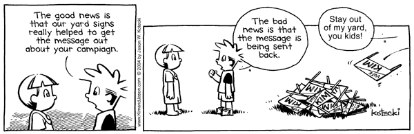 Jeez, we put a lot of work into those signs. Not only did we cover them with destruction paper and color them all ourselves, but we had to dig up all the other candidates' signs in other people's yards first.
