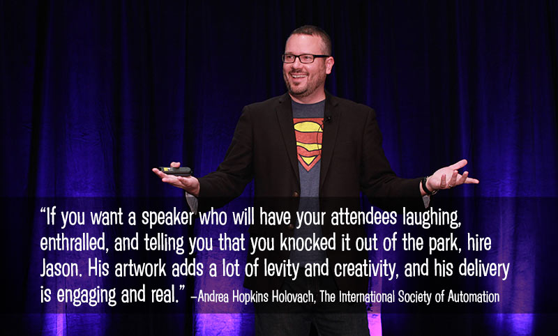 Jason’s keynotes are like a tall glass of Kool-Aid, refreshing your audience and energizing your event. Every program introduces the negative effects of Adultitis and features his trademark wit and whimsical artwork that become sticky metaphors to help people remember the life-changing concepts he shares.